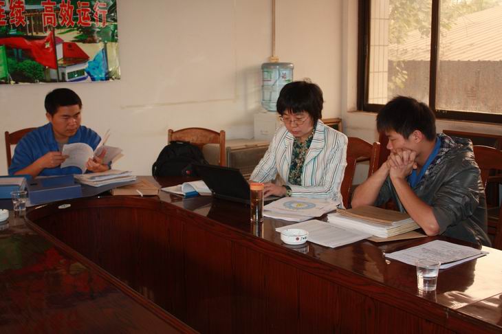 图为中国船级社质量认证中心审核职员在该公司生产部认真地审看相关文件。